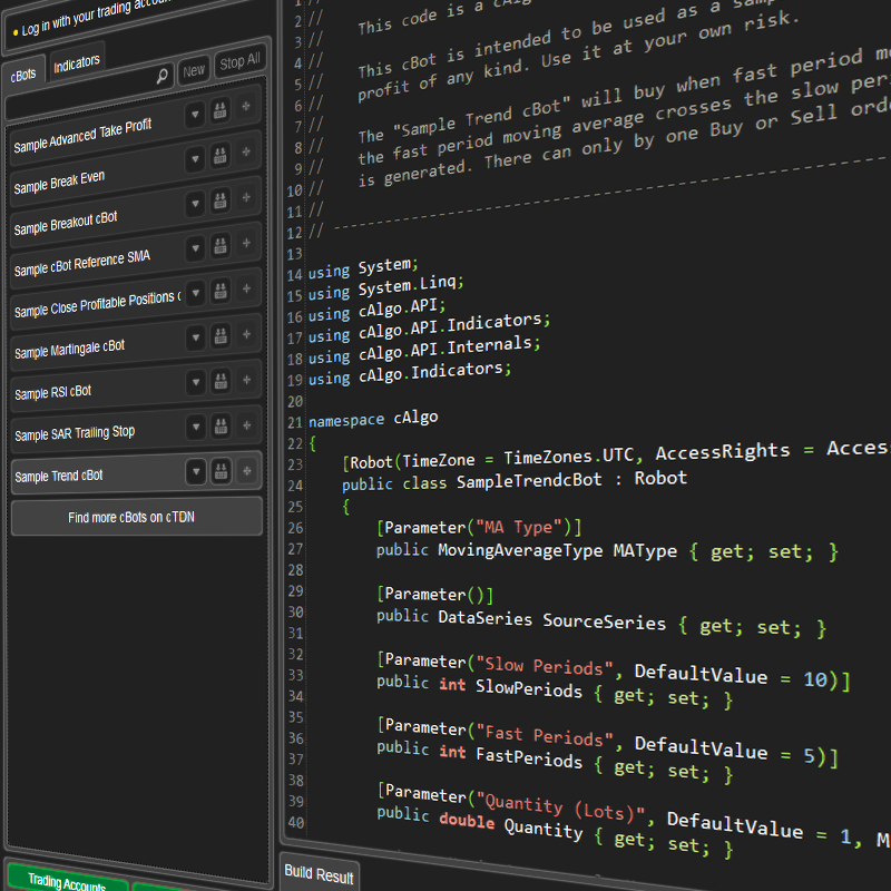 Axiory cAlgo Editor is a coding application compatible with C # and .NET frameworks which enables users to create their own algorithmic trading strategies and custom indicators. It offers its own code editor and many useful back-testing functions for more advanced and accurate algorithm development. The automatic trading algorithms developed in this application can then be directly and smoothly used in cTrader.